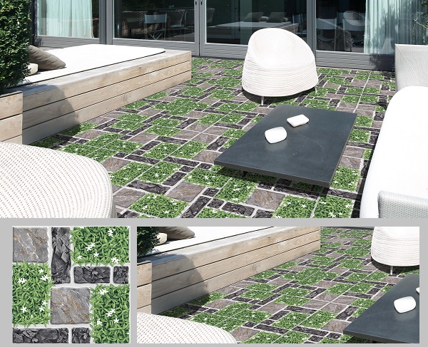 Cũng sử dụng họa tiết cỏ lá gừng điểm hoa trắng nhưng Ý Mỹ A505SE kết hợp cùng với họa tiết giả đá tự nhiên màu xám – đen vân trắng.